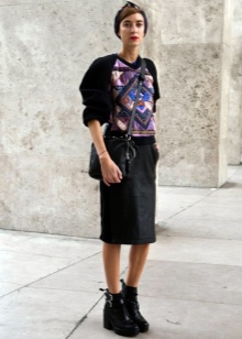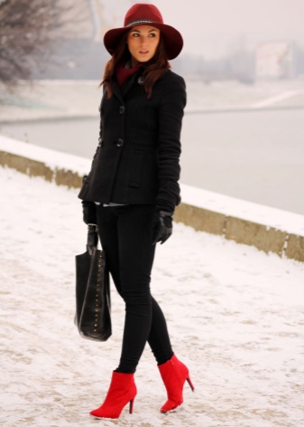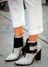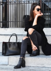 Black leather ankle boots with high, wide heels are appropriate with any look. For example, with a checkered miniskirt, turtleneck and black drape. A great outfit for the office, and for meeting friends, and for walking around the city.