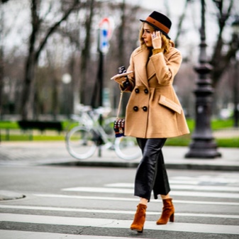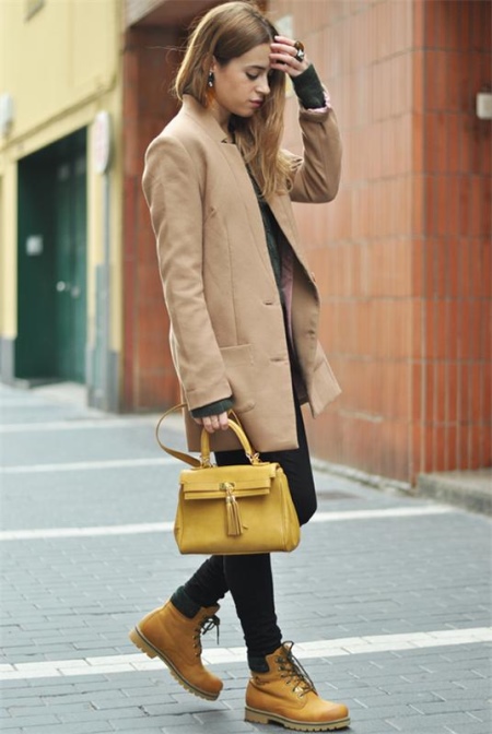Classic timberlands perfectly complement the outfit of tight black jeans, a sweater and a cropped light beige coat. A small mustard-colored leather handbag will complement the look.
