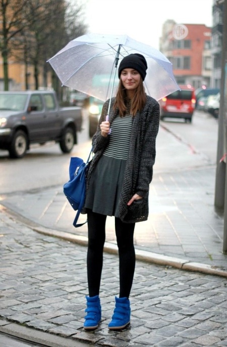 Bright blue sneakers will effectively complement discreet colors with a casual outfit of a skirt, sweater and knitted cardigan. Another accent to the image will be a blue handbag.