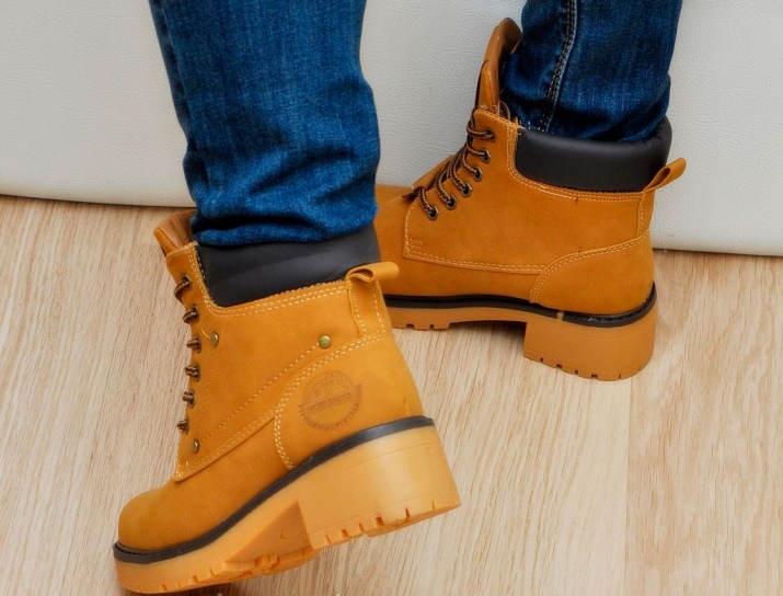 - Timberlands. A great option for those who primarily prefer convenience and comfort. The classic model consists of boots made of nubuck or soft mustard leather on a thick grooved sole. Often complemented by a fur lapel. Clasp - laces.
