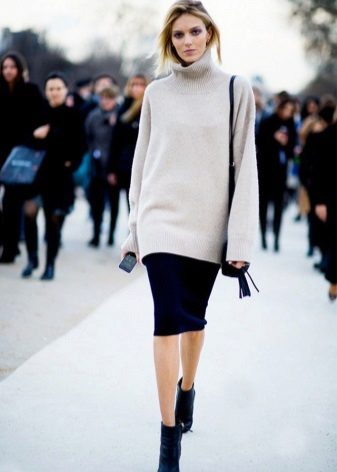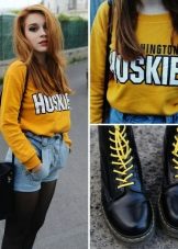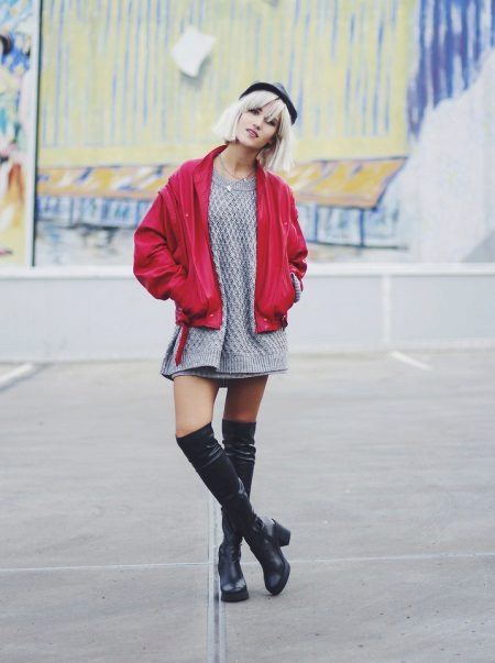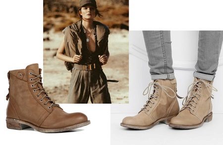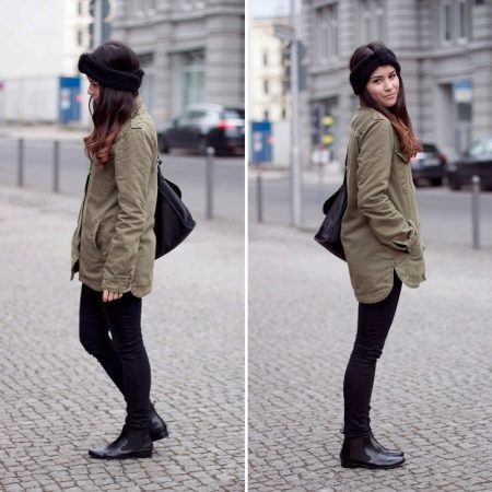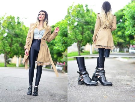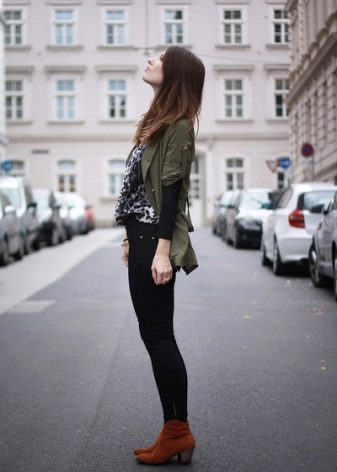 Military-style boots are in perfect harmony with both fitted and loose clothing. It is appropriate to wear leggings and skinny jeans complete with a spacious top. Sweaters, voluminous T-shirts and turtlenecks will look great, as well as tight-fitting.