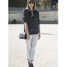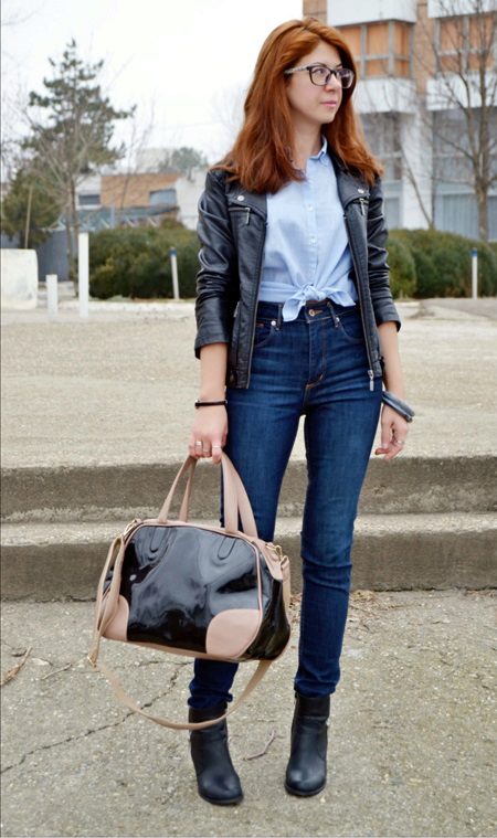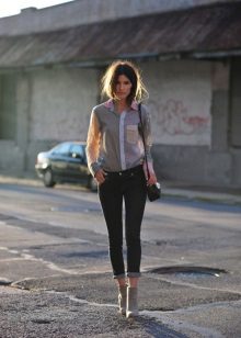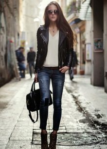 - The perfect look for warm weather. Skinny blue jeans and heeled shoes with pointed toes. A black jacket decorated with zippers gives an image of audacity, and a light blouse tied at the waist softens and adds femininity. The shoes of the classic model are the final touch of the image, but not the accent. This option shoes can successfully complement a variety of outfits.