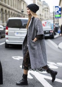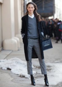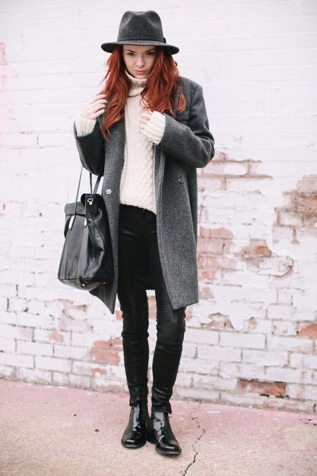 - Black chelsea boots work well with trousers. Gray coats and a hat with a contrasting light sweater look unusually stylish. The image is strict and elegant, suitable for office or business meeting.