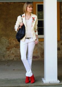 - Putting on red shoes, It is advisable to supplement the outfit with a thing or accessory of the same red color. Swamp and emerald shades of green, blue, blue, black and white will suit the redhead.