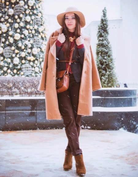 - In this image, all shades of brown seem to be collected. Suede ankle boots stand out against darker cropped trousers. The image attracts with its warm colors; it looks elegant and unusual.