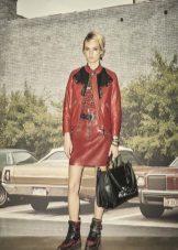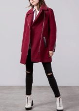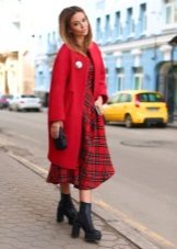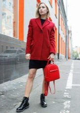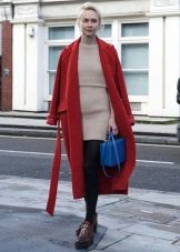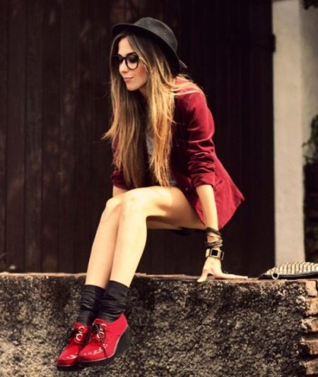 Bright, stylish, trendy. The three most important words about this image that express the whole gamut of feelings and emotions. A red elongated jacket and red suede wedge shoes - it looks original, but not shocking. Slightly black socks add to the image of romance and everyday life.