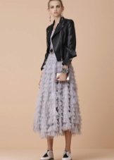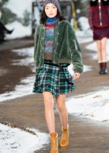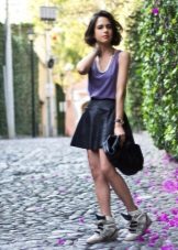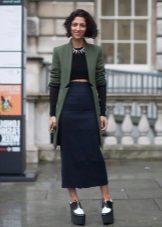 When combining women's shoes with thick soles with skirts, one should not only adhere to one's own preferences in length, material and model. Particular attention should be paid to the proportions and proportions of the length of the skirt, the height of the shoes and the "quality" of your legs. Here, as in the situation with shorts, a variety of tights, knee-high socks and leggings are very cool for a clear mini.