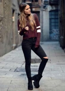 Trousers of absolutely any cut fit this shoe. Even wide eastern bloomers. Skinny cropped or cropped jeans are considered ideal.