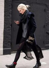 Holders of a thin, elegant ankle can safely combine Chelsea boots with A-line skirts in midi length. A plain bottom can be varied by the presence of a pleated or corrugation, but it is better not to expand the bottom line too much. Otherwise, the aristocratic chelsea will look like galoshes.