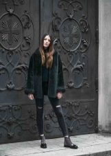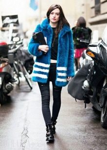 - Faux fur coat length to the middle of the thigh or palm above the knee. Dark denim jeans of an adjacent silhouette, a turtleneck or a man's shirt will help to complement the image. Chelsea is better off choosing patent leather or suede on a small platform.