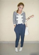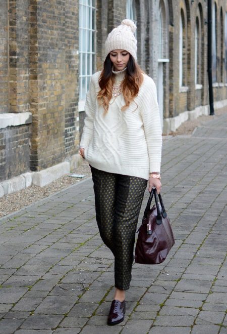 Stylish trousers with arrows are made of dense but soft fabric with an unobtrusive print. A voluminous white sweater and a hat made of thick yarn are an excellent complement to these trousers.