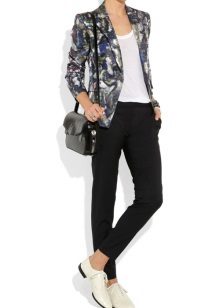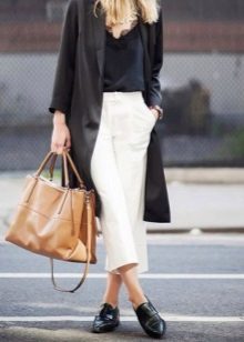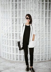 Black straight-cut trousers with neat arrows combine perfectly with a white knitted sweater and a black elongated jacket with two buttons. A stylish clutch with an oriental print will be a bright complement to the image.