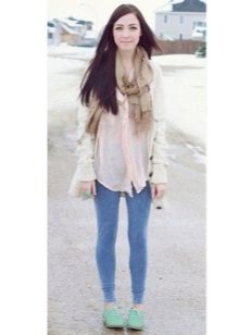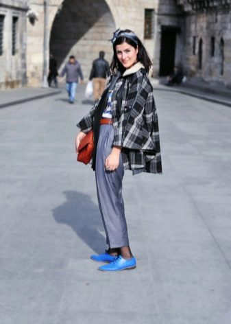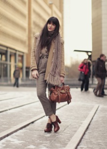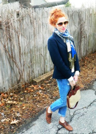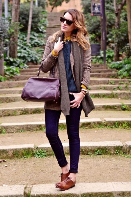 One has only to choose the right model and a blue narrowed model - just what you need. A stylish blue sweater is perfect for jeans, and a combination of a checkered coat and a gray knit scarf and brown oxfords Perfectly complement the outfit.