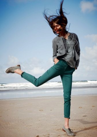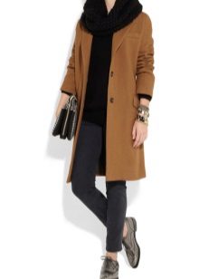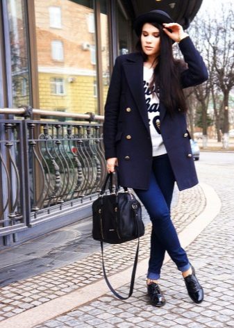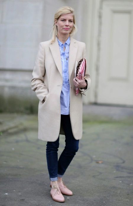 Skinny dark blue jeans with lapels, a light blue cotton tunic are the best option for a comfortable pastime in an informal setting. A light beige cashmere coat is perfect for outdoor wear.