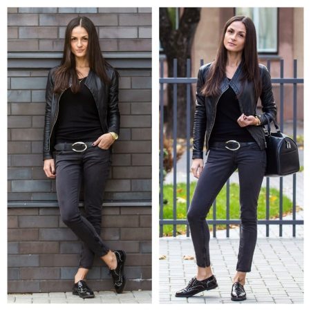 - Leather leggings look incredibly stylish in combination with black and white lacquered oxford shoes of a classic model.