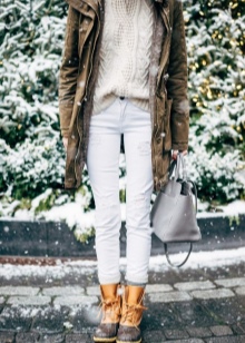 Tight pants, skinny jeans and short shorts will perfectly complement the interesting ensemble, which includes orange boots and a light top: sand-colored turtlenecks, white sweaters and jumpers, shirts and tops.