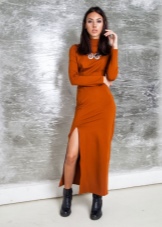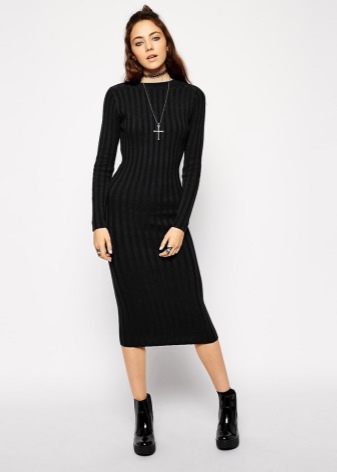 As a rule, such dresses have the simplest straight cut, which, due to the amazing texture and amazing appearance of the material, is able to emphasize the feminine silhouette of its owner. Such an element requires complementing oneself with short boots of the type of jodpur with a heel or platform, which will ideally suit both a long dress and a mini-length dress.