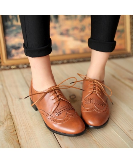 Stylish and feminine brogas differ from oxfords by the presence of perforation. These shoes are ideal for warm and dry weather. They look more flirty compared to classic oxfords.