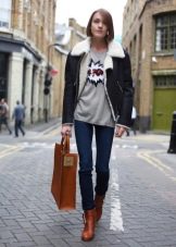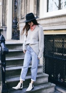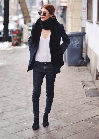 Jeans can be made of different materials. For example, velveteen models go well with suede or leather boots. The main thing is to observe the combination of colors of things.