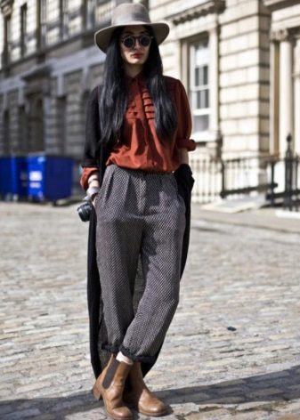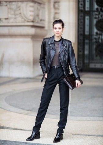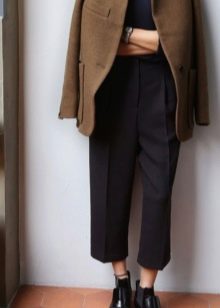 If you want to create an original and stylish look, you can choose a business outfit based on a men's trouser suit. A good ensemble can be obtained using long trousers. For example, models with wide legs made of dense material will look harmonious with chelsea.