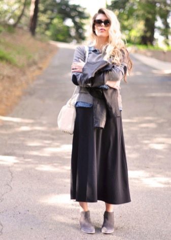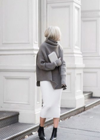 - An interesting image can be obtained if you use certain details in the style of the 90s. In those days, many fashionistas wore long monochrome skirts and spacious sweaters. A similar set of clothes goes well with chelsea boots.