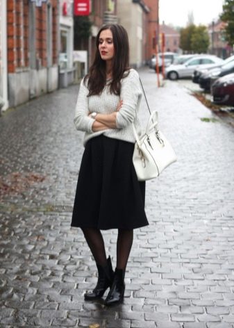 This season, at the peak of popularity, a combination of chelsea and a plain A-line skirt. True, this tandem is not always adequately treated. This is partly due to the fact that boots with a wide boot and a mini flared type can look attractive only on neat legs with a delicate ankle.