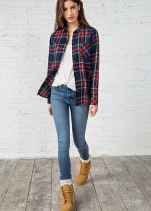 - For fans of casual style, timberlands can be complemented with jeans of any shade and style or dark leggings. Jeans can be tucked in or worn out. A checked shirt that goes well with jeans will suit yellow boots along with a warm vest and a matching belt to match the shoes.