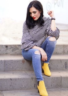 The main rule is that dresses, skirts and trousers in a strict business style are not suitable for yellow nubuck boots. But jeans loved by modern youth and yellow boots combine perfectly! Moreover, the image can be completely different in character.