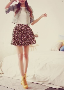 - If you really want to put on a skirt with yellow shoes, then a dark dress below the knee with a protective jacket and a heavy metal bracelet or a chiffon dress above the knee with delicate tights is quite suitable. The most courageous girls combine timberlands with a safari skirt, a light blouse and a leather jacket and look in this way bright, fashionable and original.