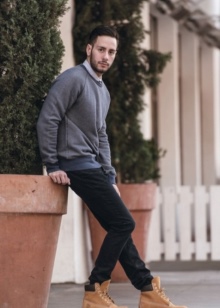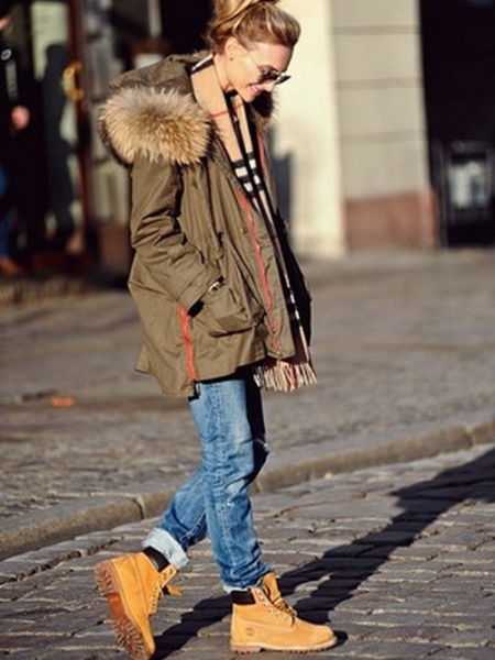 - For fans of the military style, a combination of timbers with khaki pants and a neutral sweater is suitable, a jacket parka of a shade close to boots will make an excellent color pair and complete a cheerful image.