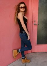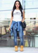 Fashionable summer ensemble in casual style, military or safari will complement perfectly Timberland lace-up boots. Such shoes look good when they are not too tightly laced, for example, you can not lace them up or skip eyelets.