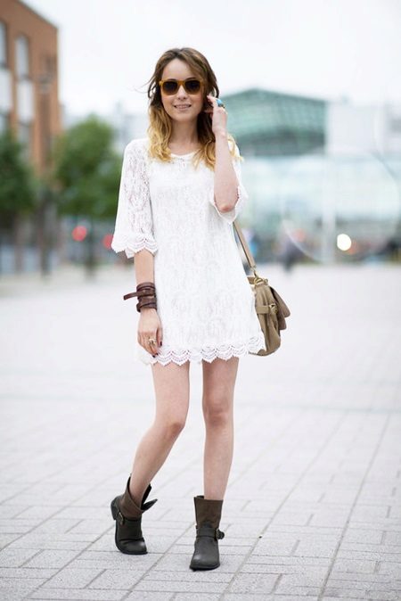 The original image, built on contrast. A short dress looks extremely feminine: a snow-white color, lace texture, a romantic flared silhouette and sleeve style. At the same time, these clothes are complemented by deliberately rough shoes of a dark brown color with a worn effect. The shoe has a shortened free shaft and is decorated with a metal buckle. Leather boots harmoniously complement the bracelet of the same texture and a beige bag with a long handle over the shoulder. The ensemble is completed by the girl’s casual hairstyle and sunglasses.
