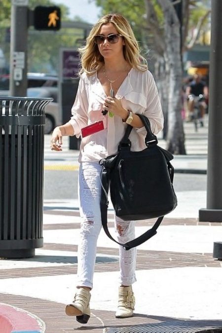 A casual summer ensemble - a lightweight low-cut shirt and ripped youth jeans - combines with short cowboy-style boots. Light beige shoes have a small steady heel and are decorated with three wide straps with golden buckles. The black color of the heel corresponds to the color of a voluminous roomy bag. We note the elegant accessories that complement this stylish look - an elegant gold necklace and a watch of the same color