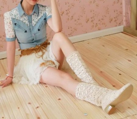 High Top Models until recently worn in summer only in rainy weather or for a trip out of town. Today, they are increasingly complementing stylish feminine images. There are knee-length boots, as a rule, they are perforated. At first glance, it may seem that such models are too hot, but due to the natural material and breathing structure, you will feel very comfortable in them.