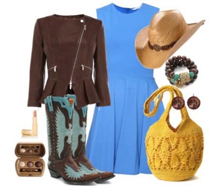 An interesting ensemble for a cool summer day - a feminine dress with a cute floral print is complemented by a short denim jacket (things blend perfectly in color). Lightweight short boots match a color bag with fashionable fringe. Black shoes are made by an elegant ornament of silver rhinestones and a small triangular neckline at the top of the shaft.
