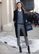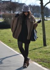 - The combination of calm colors does not look very boring. The trench coat and ankle boots in the same color scheme are complemented by narrow black trousers and a classic gray blouse. A bright accent of the image, of course, is the hat! The girl in this outfit cannot be missed.