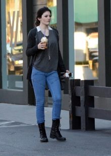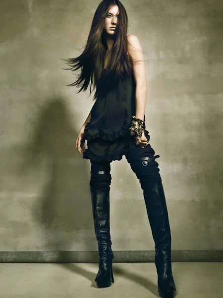 One of the hottest trends is lacing. She looks cocky, confident and very serious. It doesn’t matter how long the bootleg will be; the main thing is that there are laces that encircle the leg.