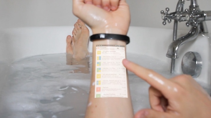 French experts have developed a model of bluetooth device that turns the skin into a touch panel. Mini projectors are integrated on the side of the Cicret bracelet. Proximity sensors, Bluetooth and Wi-Fi literally carry all the information on hand. The image is projected both on the outer part of the forearm, and on the inside. Everyone chooses how it is more convenient to use.