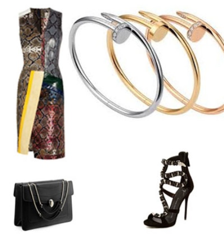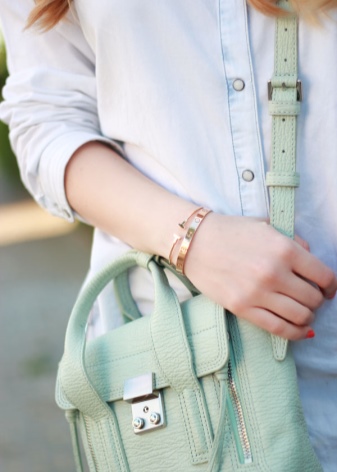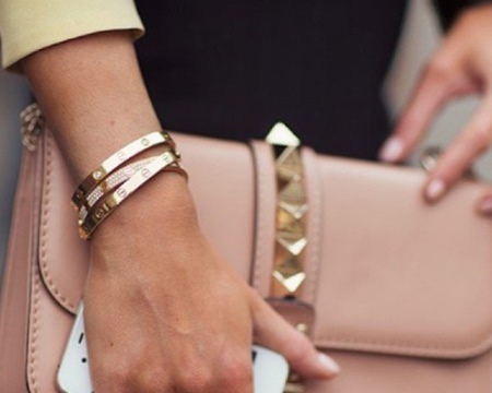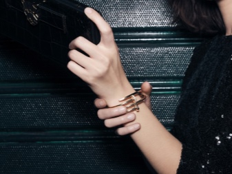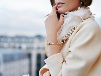 - Laconic bracelets look great in business suites. Just put on straight trousers, a light blouse, complement this set with a cream or caramel jacket and complete the look with yellow gold Cartier jewelry. With such an ensemble, pastel-colored pointed boats and a small handbag will look great.