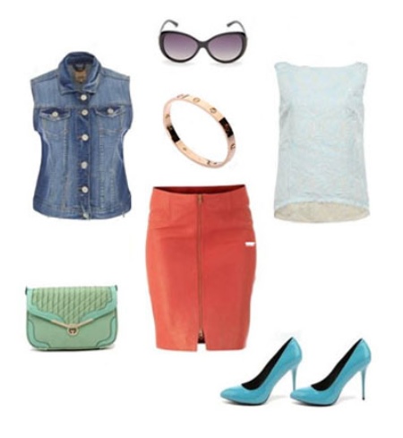 - Wear a straight or tight-fitting coral-colored skirt, light top, denim vest and complement this youth set with a yellow gold bracelet. It will look harmoniously in such an interesting ensemble (especially if you also choose charming stiletto pumps, sunglasses and a clutch bag with a cool color).