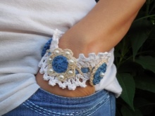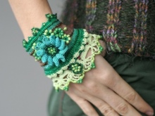 Wide bracelets are usually made in one color. When creating models, lush columns and single crochets are used, due to which the desired thickness of the products is achieved. Jewelry is soft to the touch, they are not as dense as other types of baubles, but this does not affect their strength. If desired, additional details can be connected, for example, flowers.