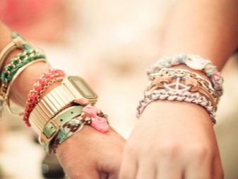 Stripes, geometric shapes, hearts, images of cartoon characters, inscriptions - this is how bracelets on a hand are decorated. Baubles differ in size. There are both narrow and wide models, the thickness of which reaches 5-7 centimeters. Accessories complement with beads, metal fittings, pendants. Methods of weaving jewelry also differ.