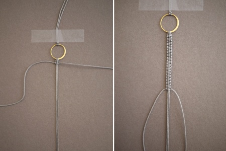 - Tie a pair of knots on the adjacent one with the right thread. Moving sequentially to the left side, repeat the action with all the following threads. Need to get to the edge - get the first row.