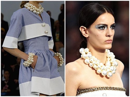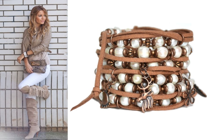 Pearls will be appropriate in any combination and style. There are familiar images that characterize this or that direction: a thin pearl string - classic and romantic, the presence of leather elements - a country-style feature, the presence of massive gold links in the bracelet refers to the Boho-chic style.