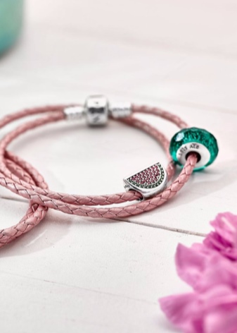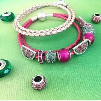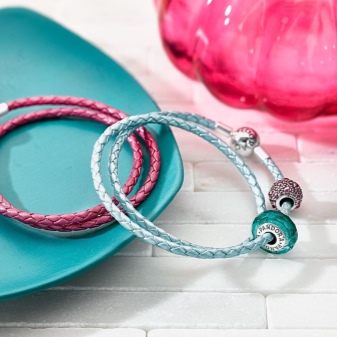 Pandora leather bracelets come in a variety of colors. White, gray and black are very popular. Since this jewelry is perfect for bright summer looks, you can buy a model of pink, blue or red leather.