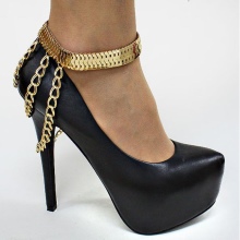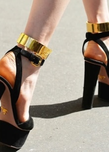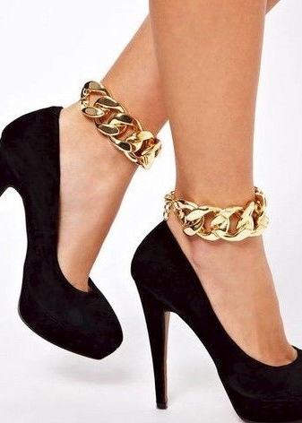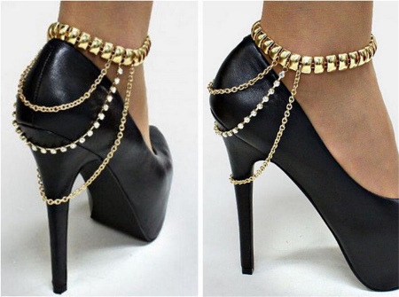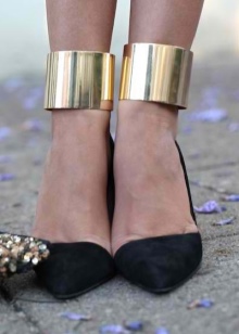 - With high-heeled shoes, the bracelet will look amazing, in which there are several additional and falling turns of the chain framing the heel. Such gold products look incredibly bright and attractive. They will be the perfect solution for a social event or a gala event. With the help of such jewelry, you can not only emphasize the luxurious image, but also pay attention to beautiful branded shoes.