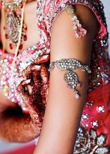 Often silver bracelets on the shoulder are decorated with natural stones and have a composite composition of several "curls" around the arm. Thus, the decoration will not only be fixed on the forearm more securely, but also look stylish.