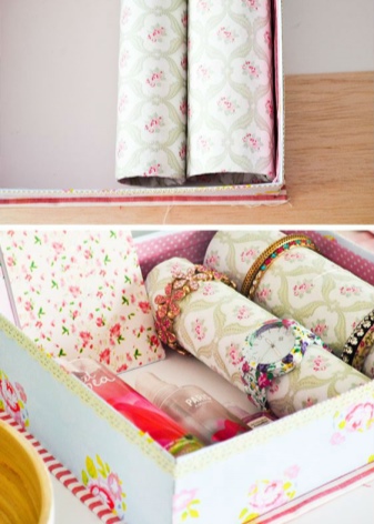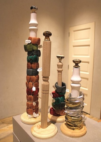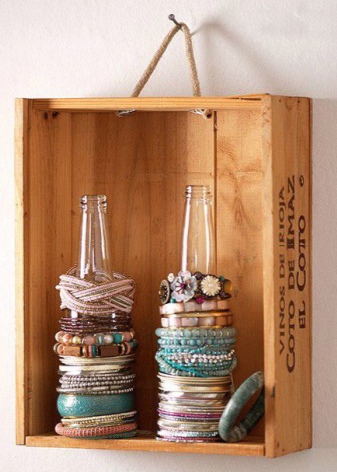 For a large number of bracelets, you can use small glass bottles for wine or carbonated drinks, on which the products will be worn one after the other. To make the device look more aesthetically pleasing, you can place the bottles in a wooden box with an open wall, painted in a light shade, or decorated with flowers.