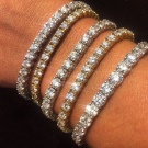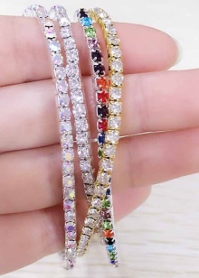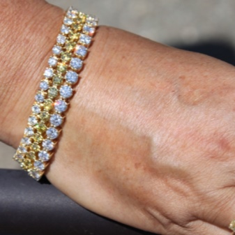 Tennis models include small pebbles that combine with a flexible metal base. When choosing this jewelry, you should pay attention to the color of diamonds. The most expensive are colorless diamonds. If the model is made of yellow gold, then the pebbles can be with light shades, since they will be inconspicuous against a yellow background.