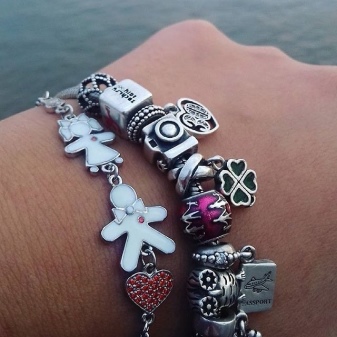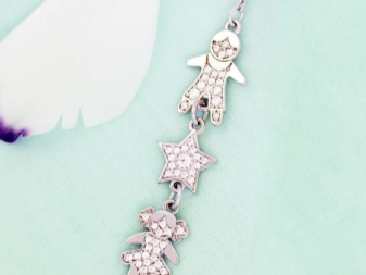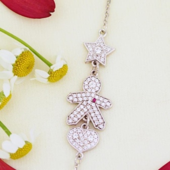 At the same time, the design of such pendants is very diverse: children can be made in a stylized theme, similar to cartoon little babies, voluminous little men. Some pendants are a double pendant: a baby figure and a heart. These are especially touching elements of the bracelet. They are often executed with a creative approach: these are clothing items adorned with stones, eyes, children's headwear inlaid with crystals, rubies in the heart zone of the figure, and much more.